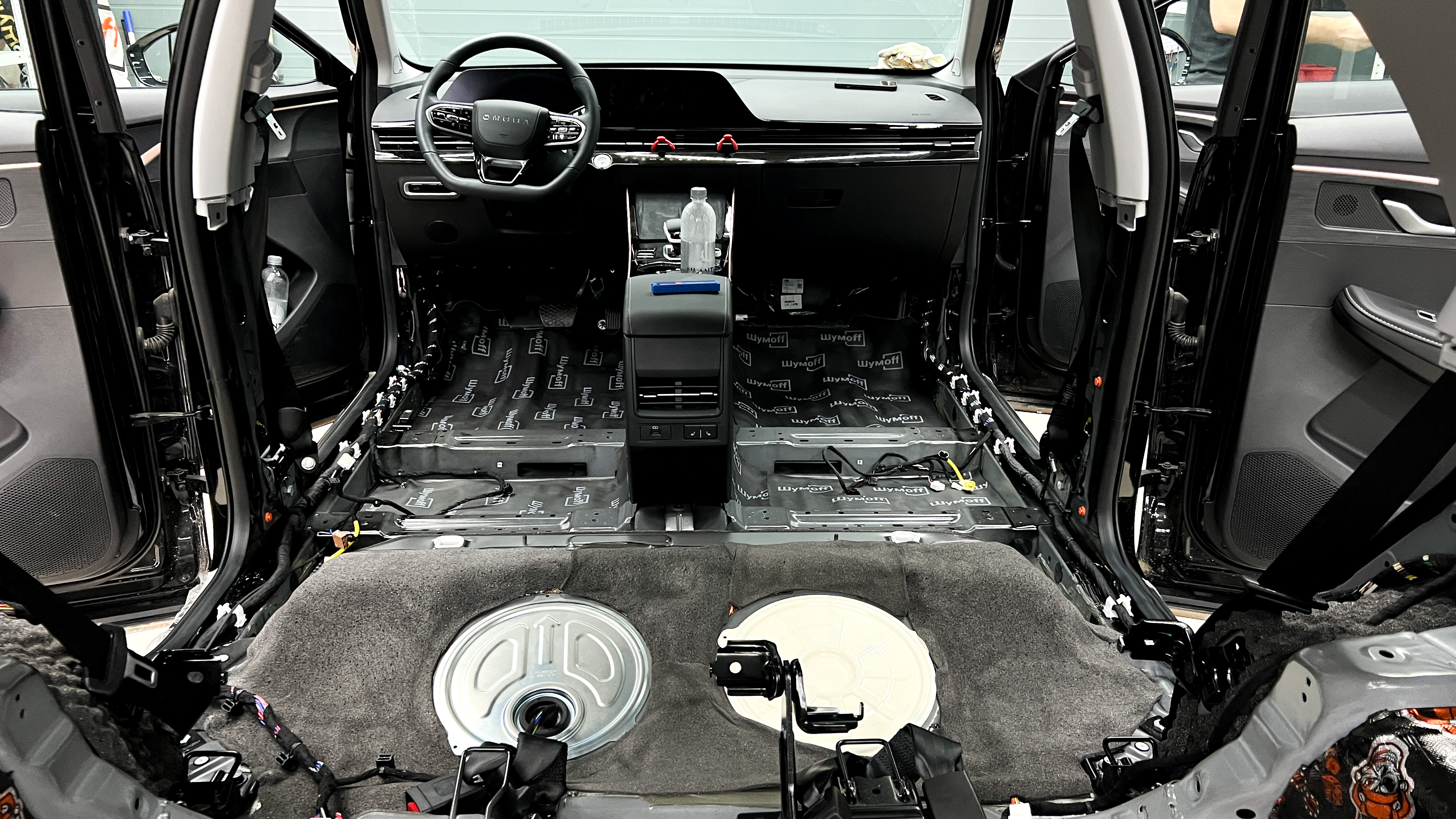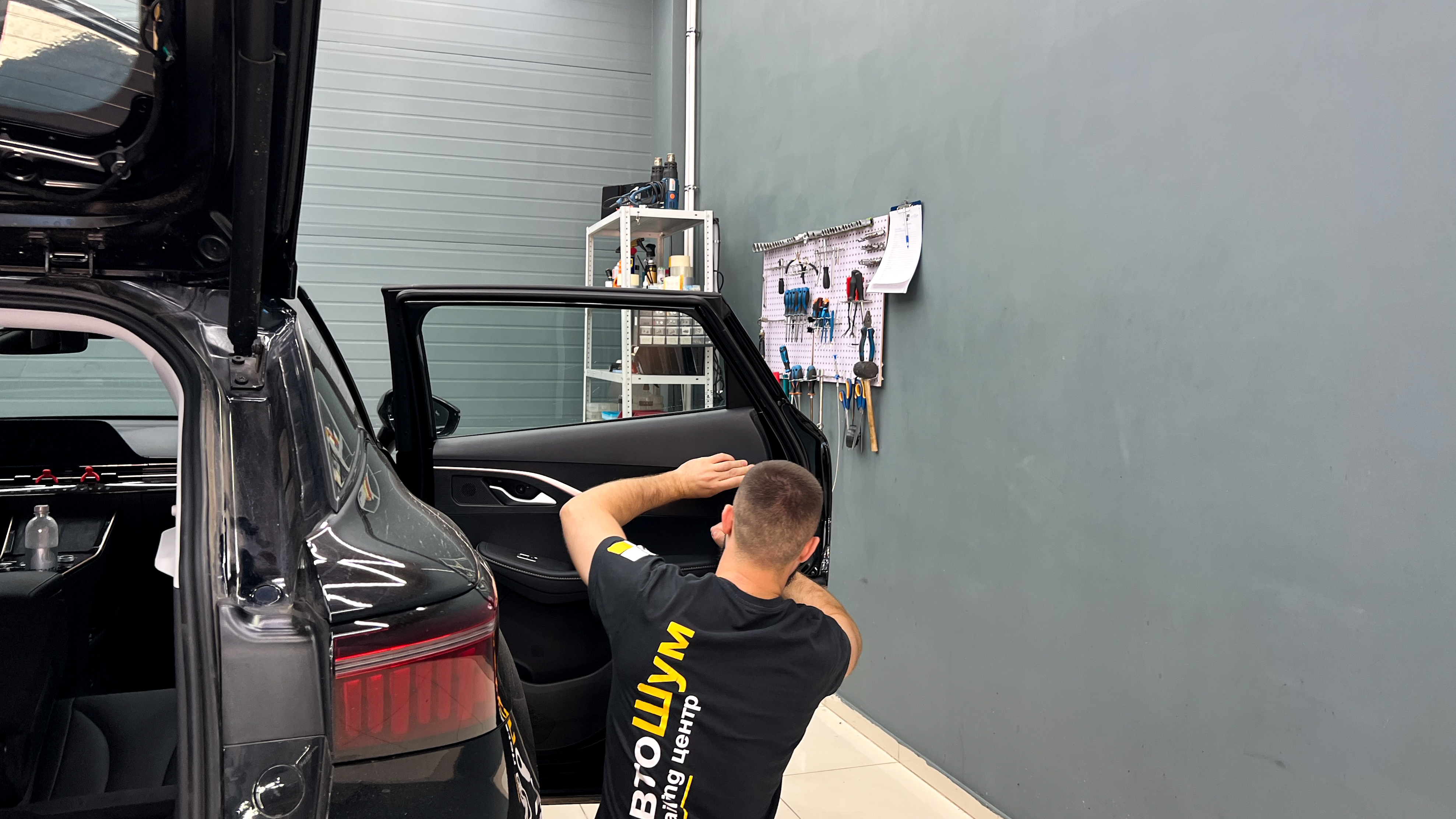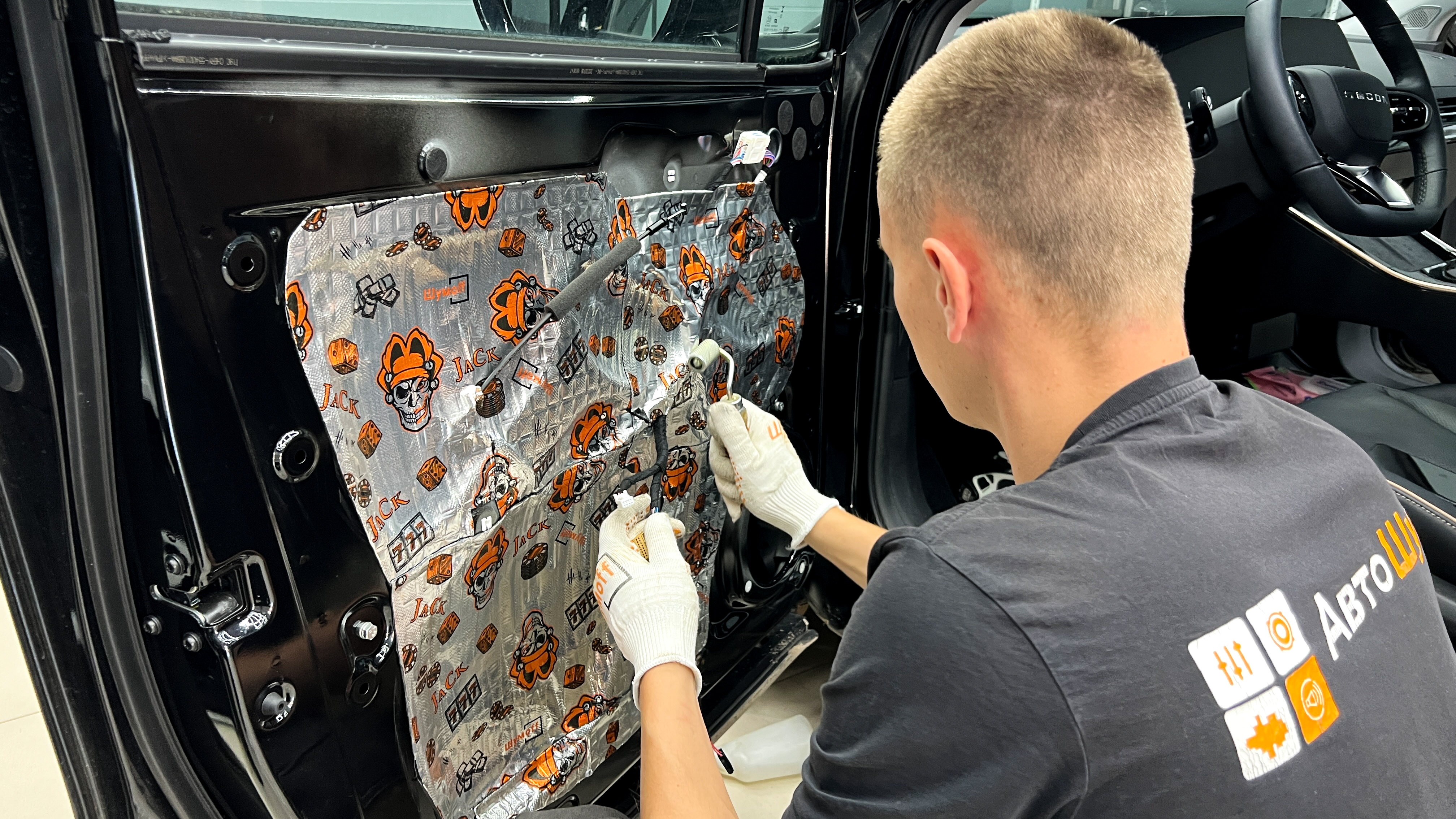 Завершаем шумоизоляцию нанесением третьего слоя звукоизоляционной мембраны Practik Finish на арки.