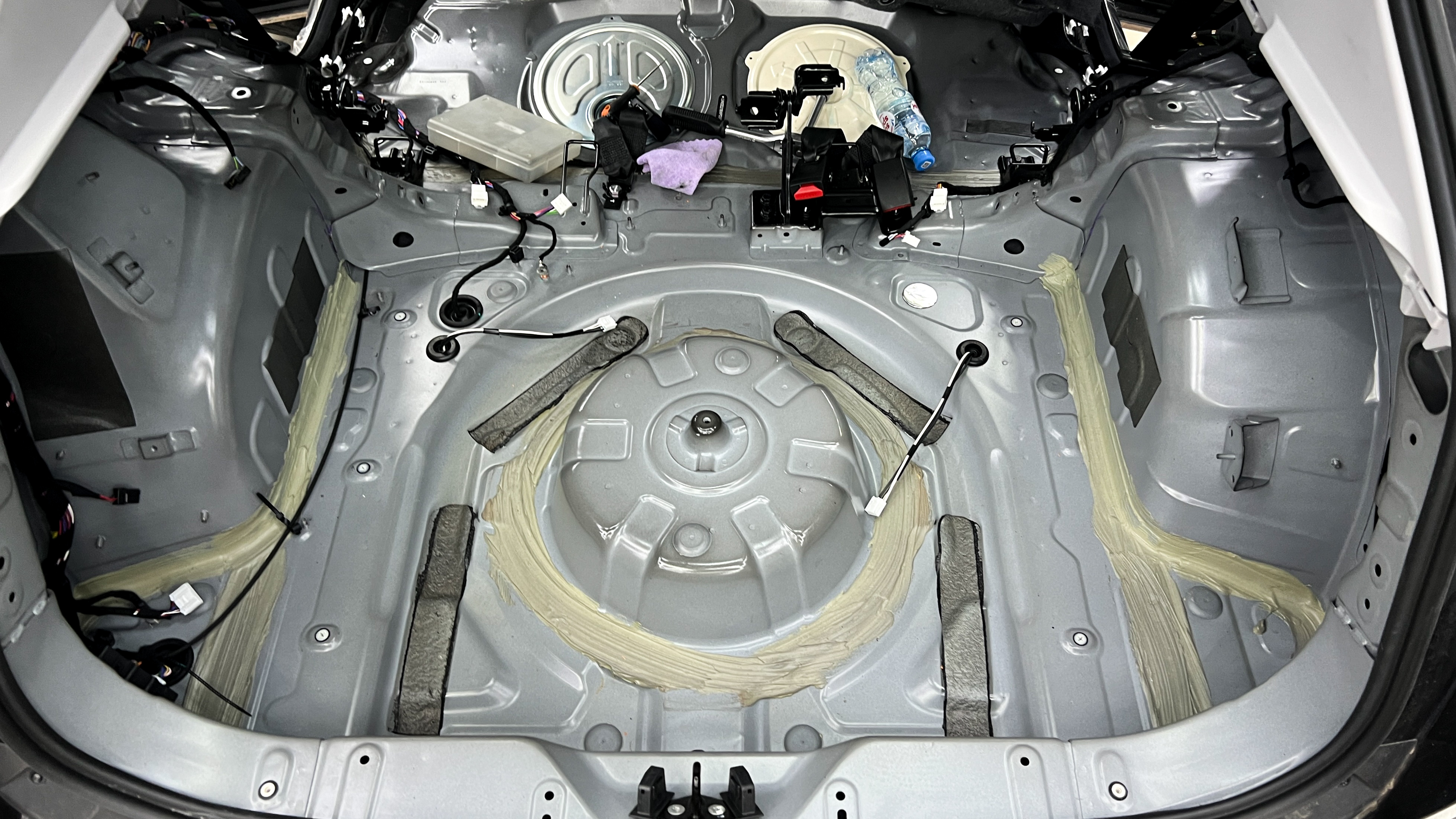 - все дно багажника и крылья оклеиваем мене толстым и тяжелым Шумофф М3.