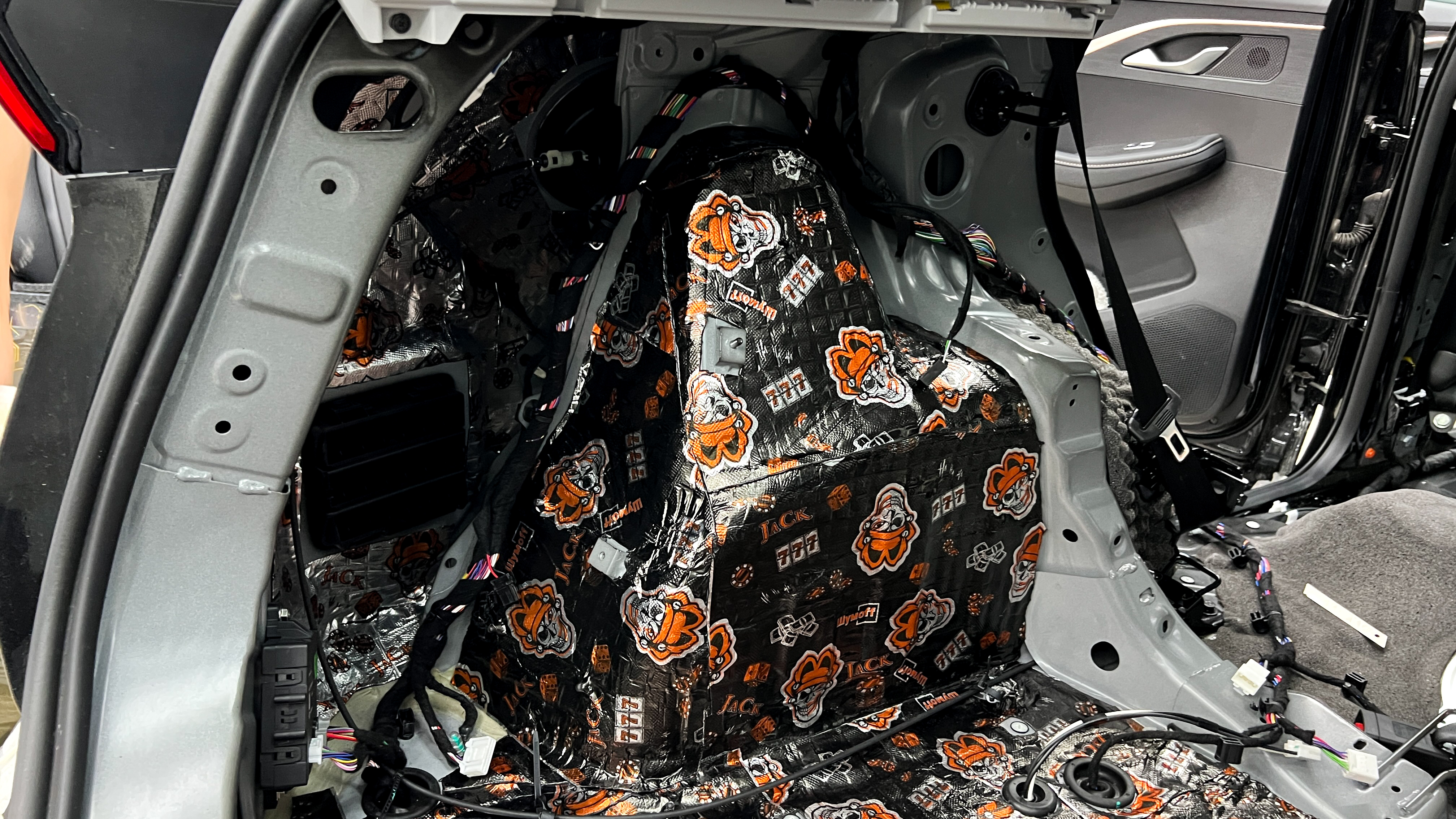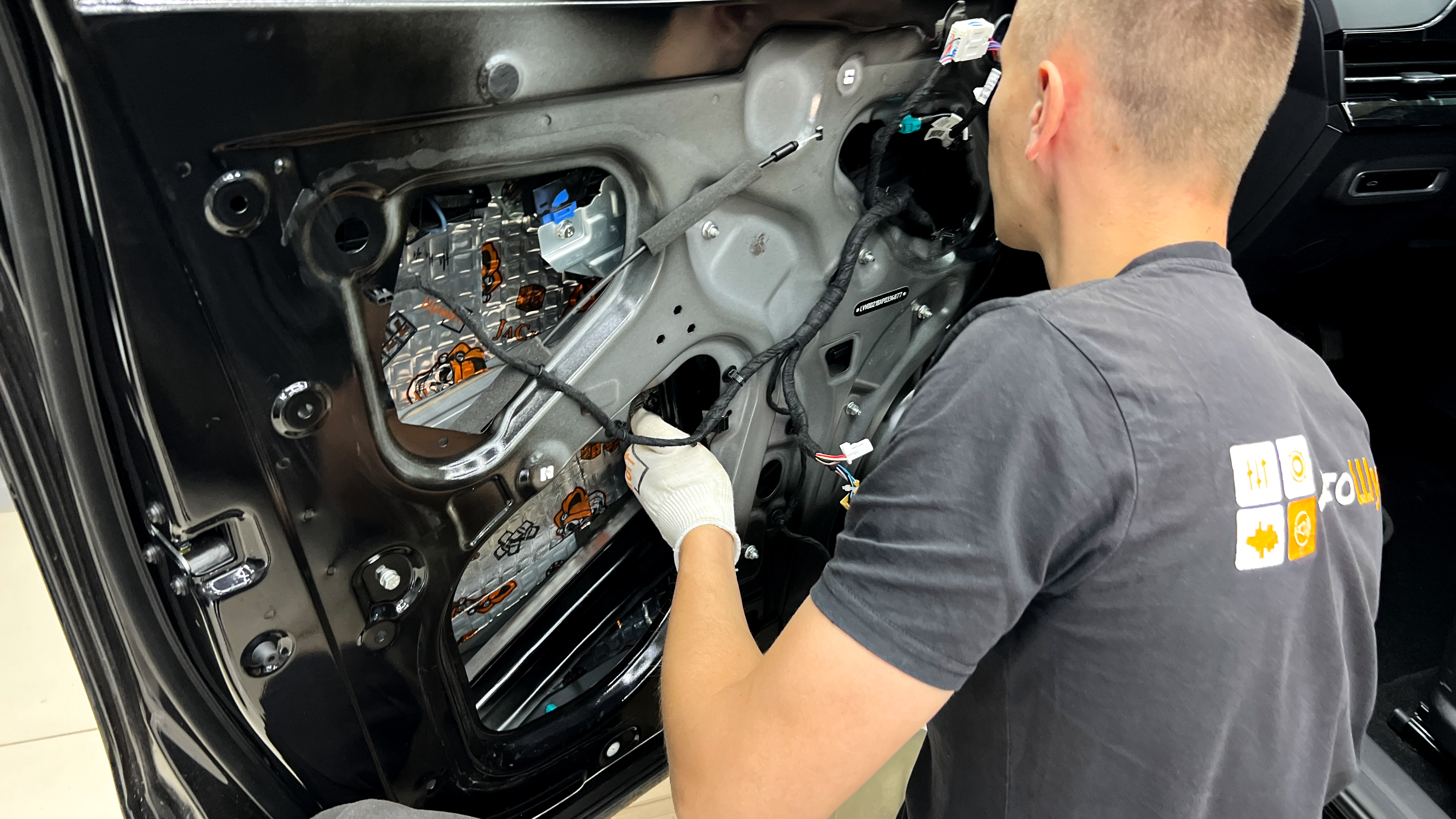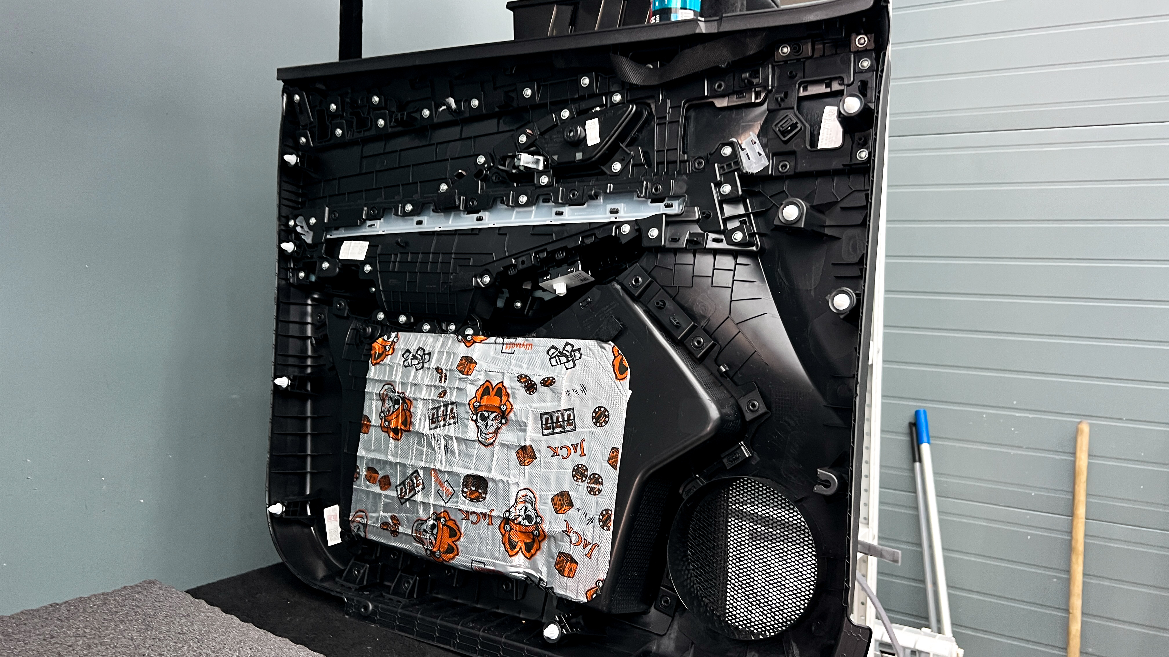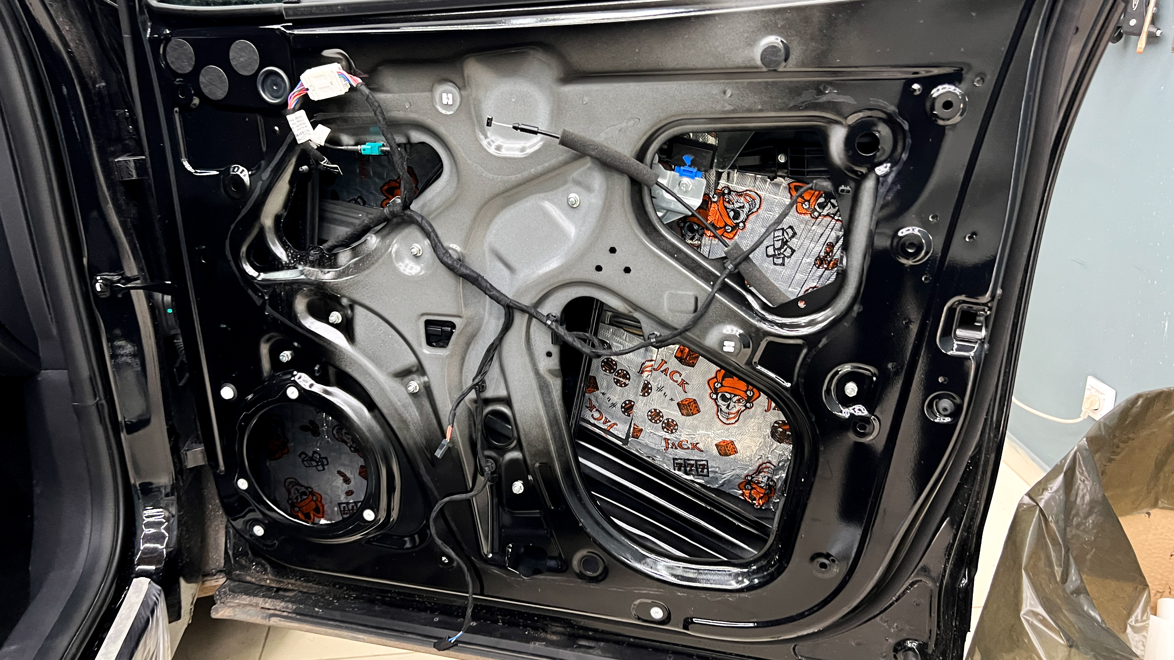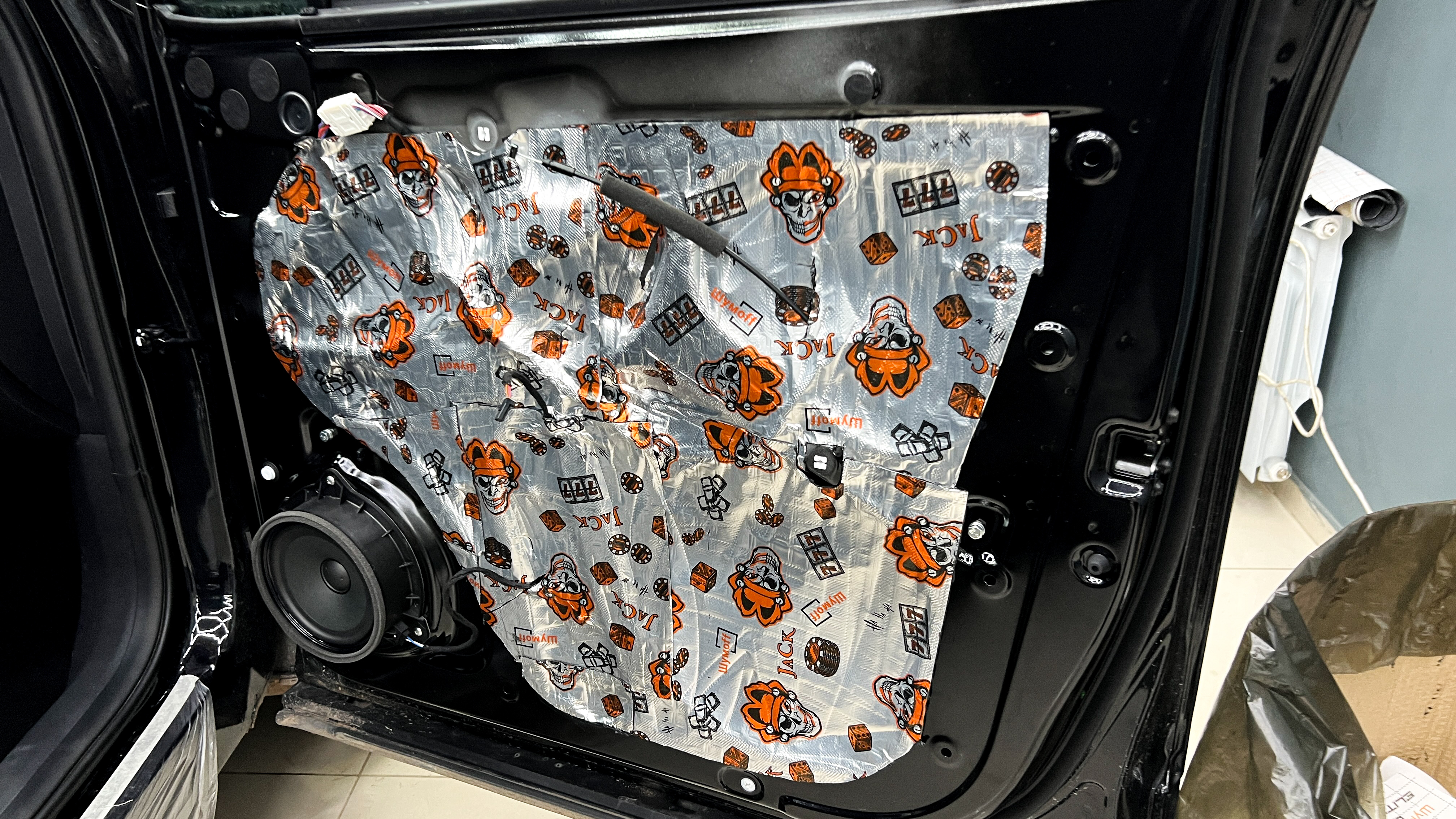 Переходим к оклейке самого корпуса панели, первым слоем частично наносим виброизоляцию Шумофф Joker, создавая тем самым идеальный баланс. Такая частичная оклейка позволит нам чрезмерно не утяжелять панель и придать ей необходимую сбитость
