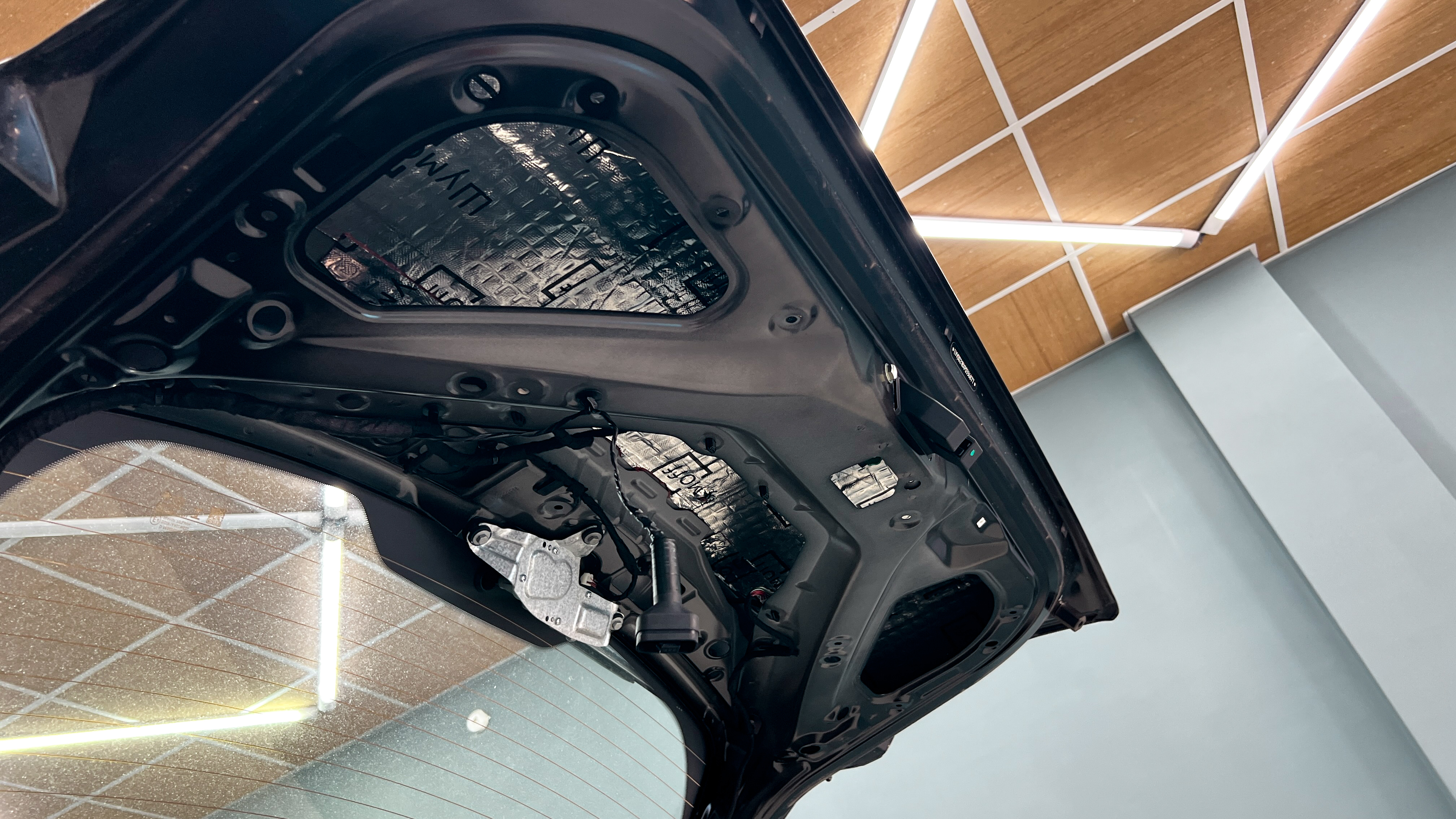 На арки клеим также Шумофф М3, а для крыльев используем менее тяжелый М2. Оклеиваем максимальную площадь багажника за исключением усилителей и ребер жесткости. Данная компоновка материалов позволит идеально достичь нужной эффективности при минимальном увеличении веса, что вместе с виброизоляцией пола также поможет нам снизить вибрацию от дороги, увеличить целостность и сбитость авто.