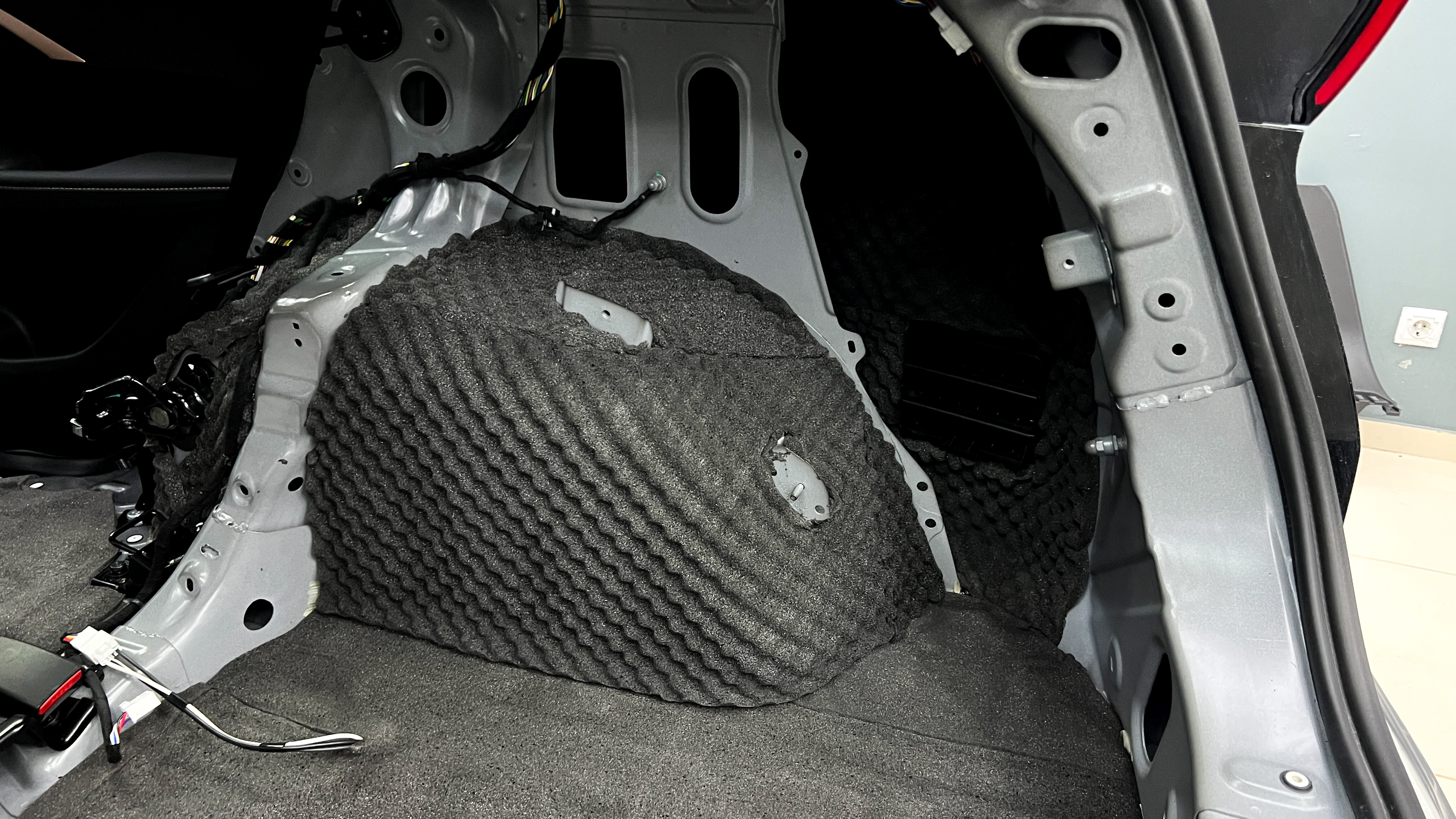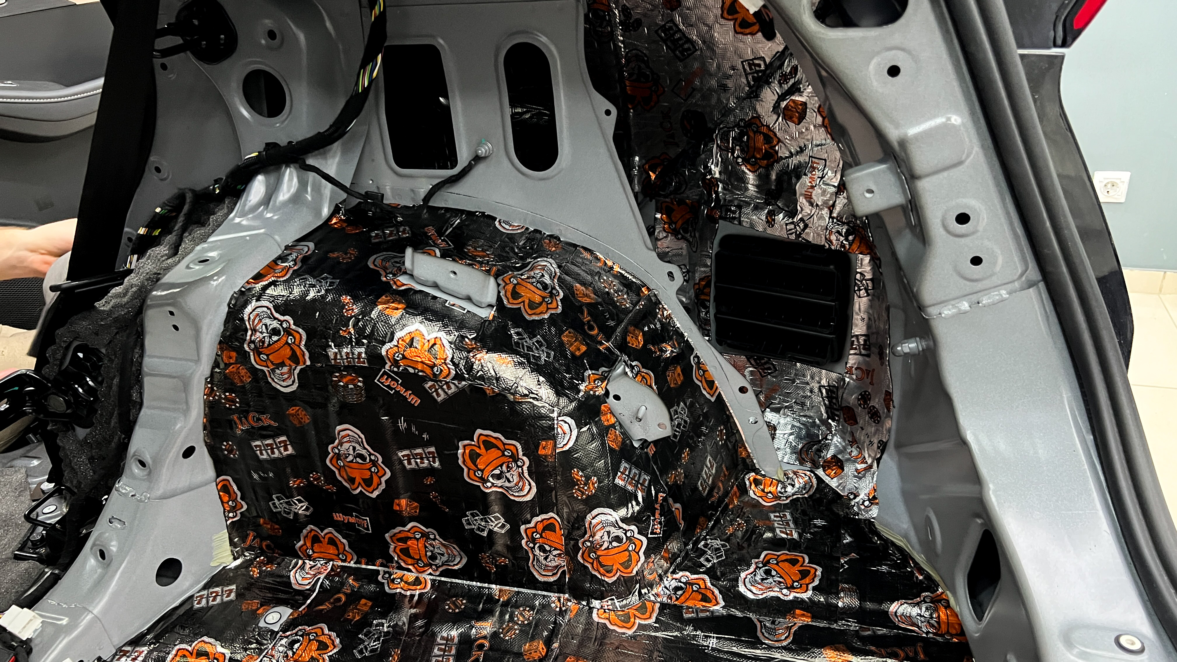 Обезжириваем поверхность и приступаем к монтажу второго слоя. Также для получения более эффективного результата используем компоновку из двух материалов На дно багажника клеим Шумофф Base 4. Этот слой позволит снизить нам шум от дороги.