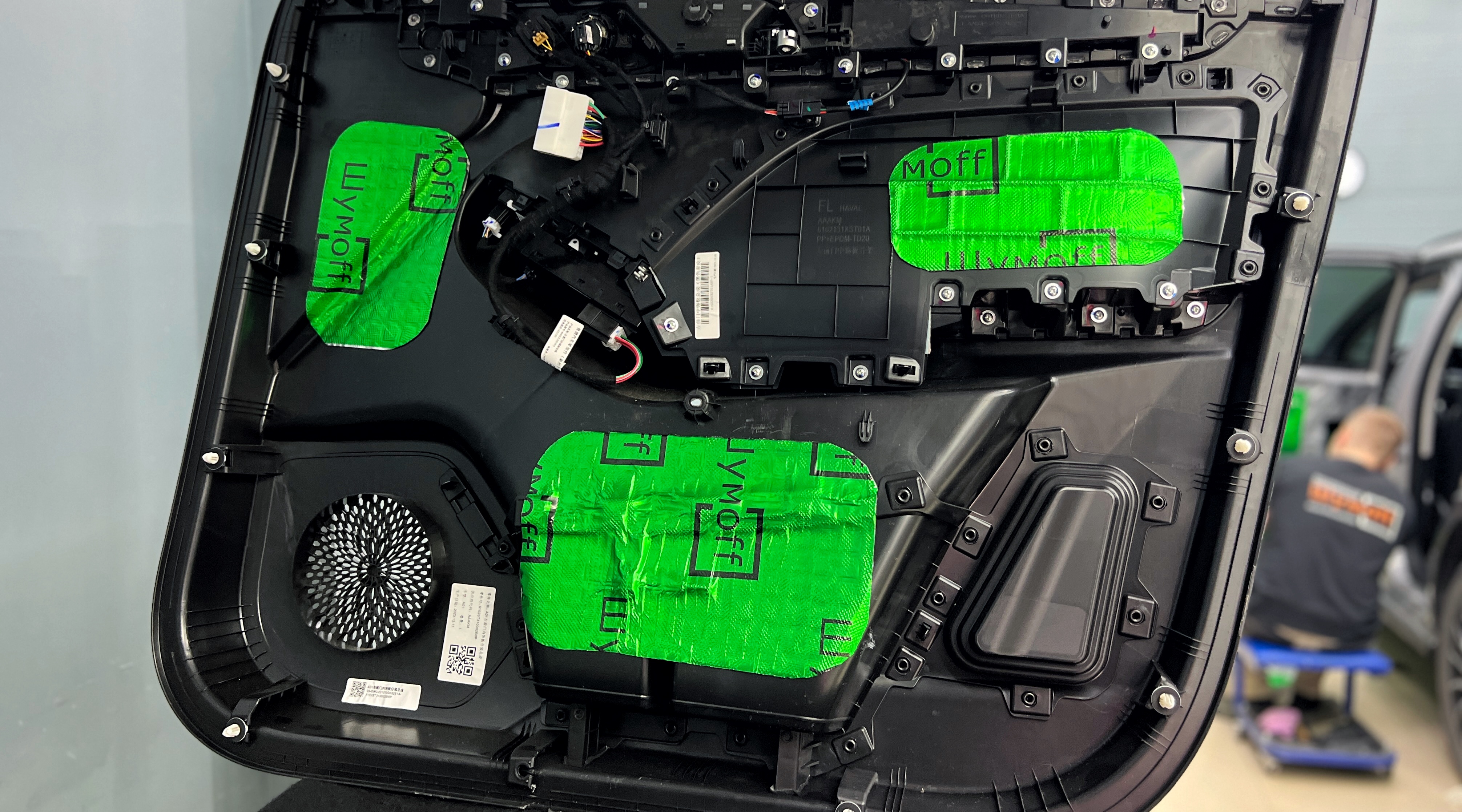Переходим к оклейке самого корпуса панели, первым слоем частично наносим виброизоляцию Шумофф Joker, создавая тем самым идеальный баланс. Такая частичная оклейка позволит нам чрезмерно не утяжелять панель и придать ей необходимую сбитость