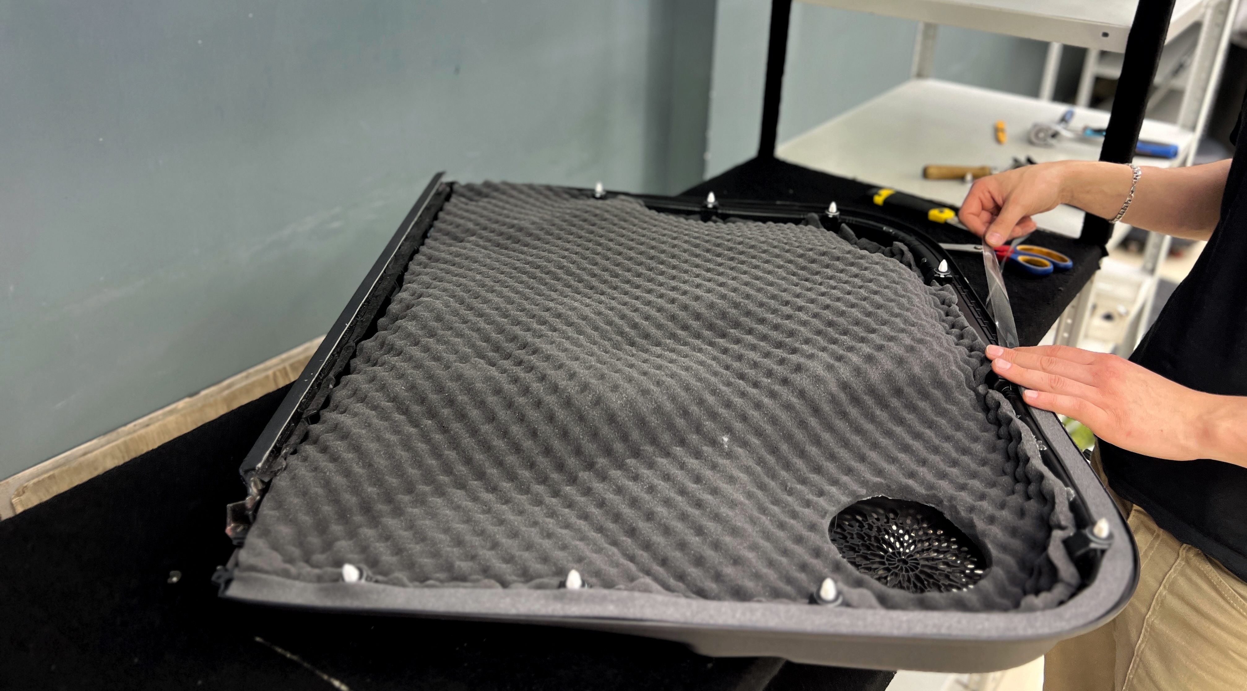 Клеим по всему контуру обшивки противоскрипный материал. Этот слой позволит нам избавиться от внешнего шума, скрипов и дребезгов.