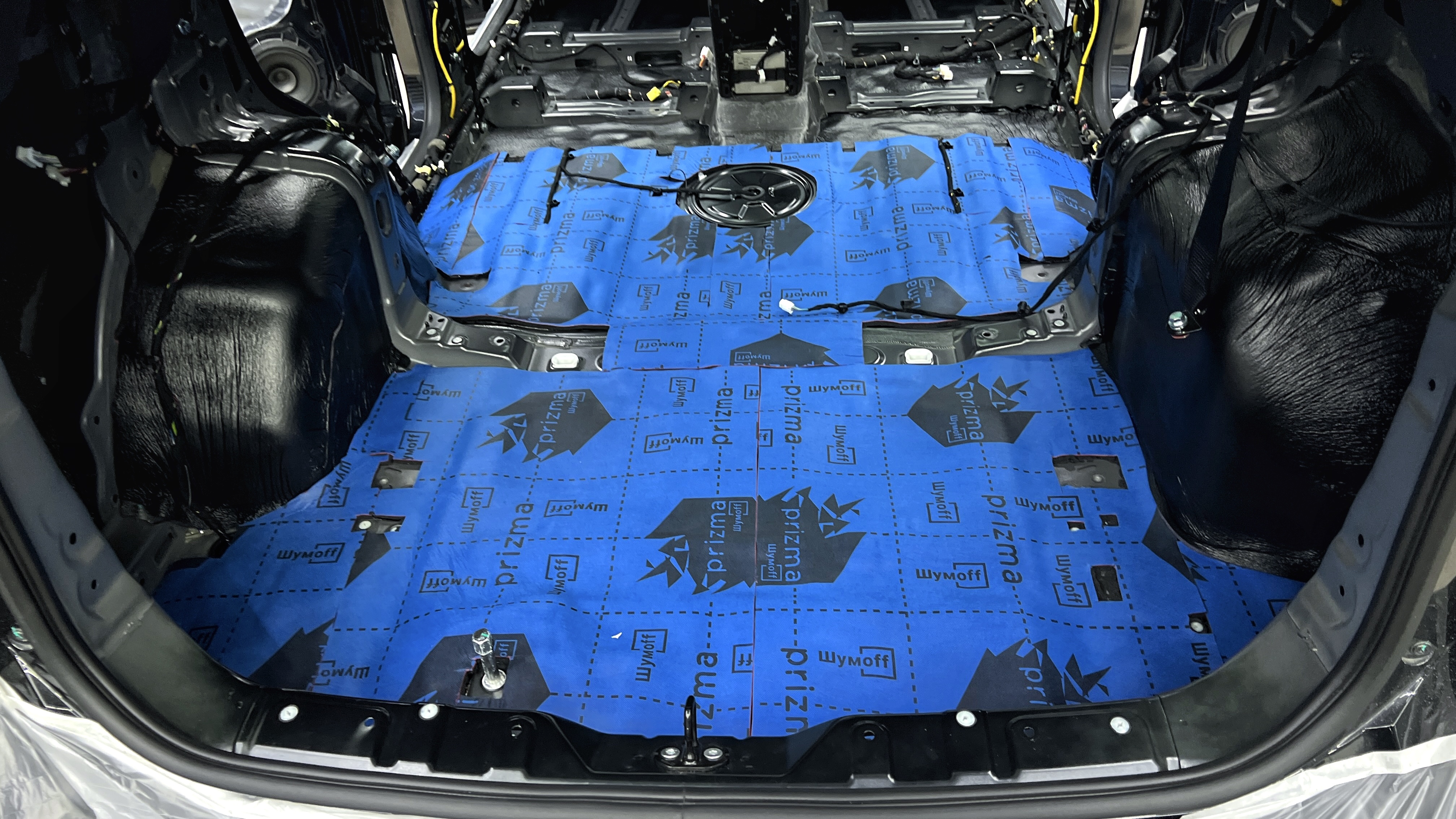 Обезжириваем поверхность и приступаем к монтажу второго слоя. Также для получения более эффективного результата используем компоновку из двух материалов На дно багажника клеим Шумофф Base 4. Этот слой позволит снизить нам шум от дороги.